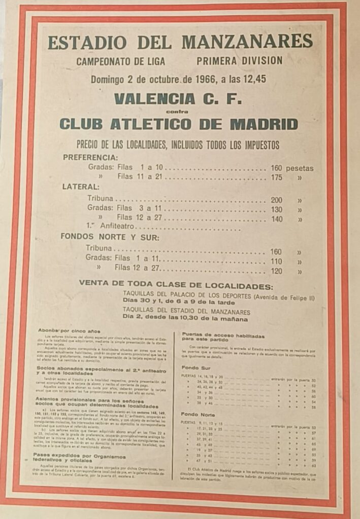 El 2 de octubre de 1966 rodó por primera vez el balón en el recién inaugurado Estadio del Manzanares, renombrado posteriormente como Vicente Calderón, a las 12:45 del mediodía. El partido que abría el nuevo estadio era un Atlético de Madrid–Valencia. La alineación del Atlético fue la siguiente: Rodri en portería; defensa para Colo, Griffa, Rivilla e Iglesias; en el centro del campo, Glaría, Luis y Adelardo; y en la delantera Collar, Cardona y Mendonça. El encuentro concluyó con un empate a 1, con gol de Luis para el equipo rojiblanco y de Paquito para el conjunto valencianista.