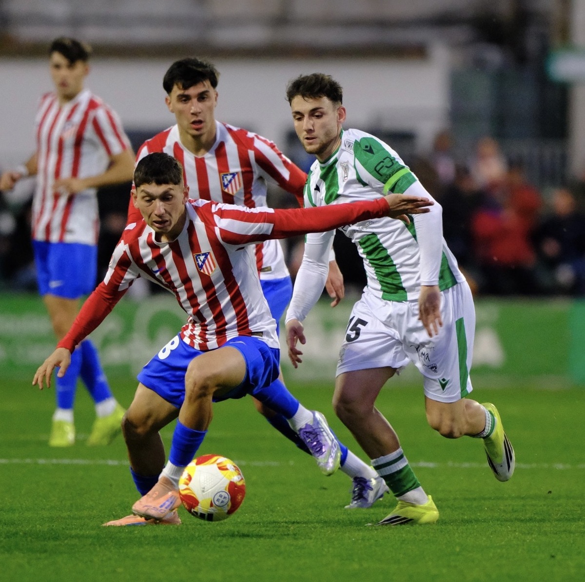 Se hizo dueño del partido el Madrileño muy temprano y generó peligro con centros al área desde las bandas. Los locales esperaban en bloque bajo y el filial colchonero no lograba convertir su dominio en ocasiones. Sí lo pudo hacer el Sanluqueño, que en la primera vez que entraba en campo rival se adelantó en el marcador. El gol llegó tras un gran pase filtrado, que dejó a Luis Simón solo para ceder a Rodri, que la empujó a placer.