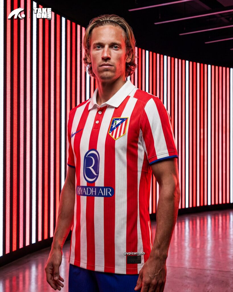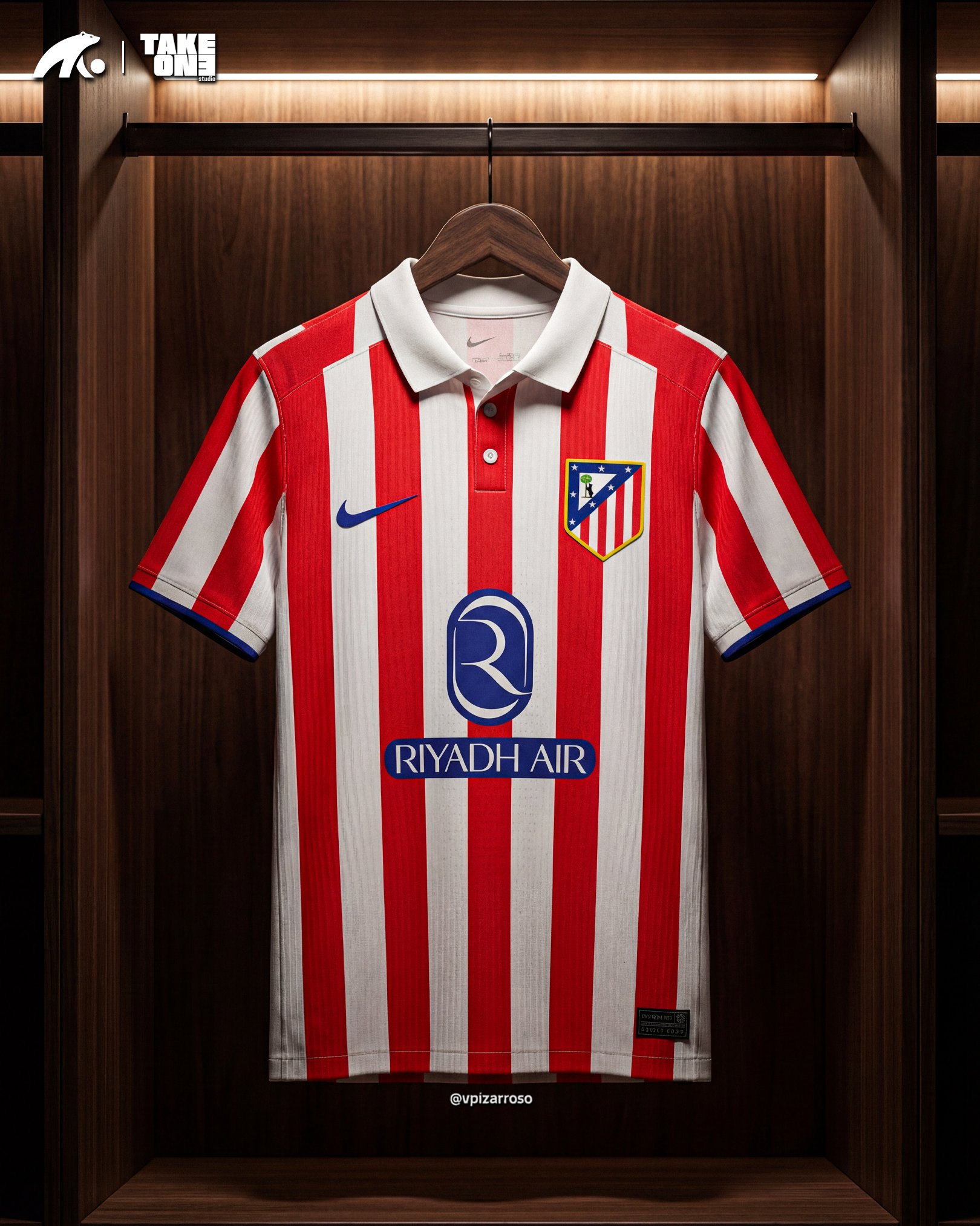 Desde AtletiMedia junto a TakeOneStudio hemos realizado un diseño mucho más clásico a lo que espera FootyHeadlines. Las rojiblancas líneas rectas y clásicas confluyen con el azul oscuro que marca la web especializada en filtraciones. También hemos incluido un cuello en la equipación, algo que no vemos desde la temporada 20/21.